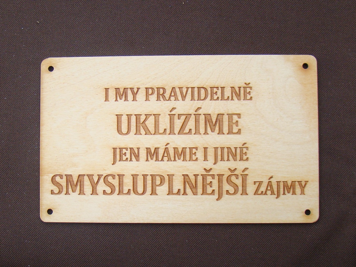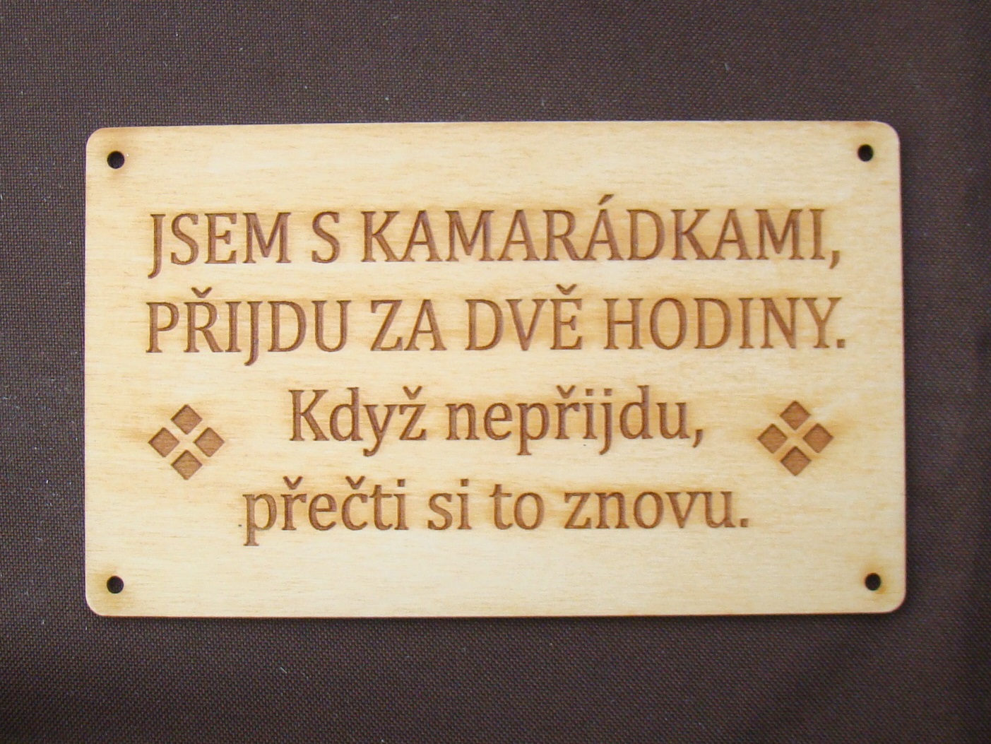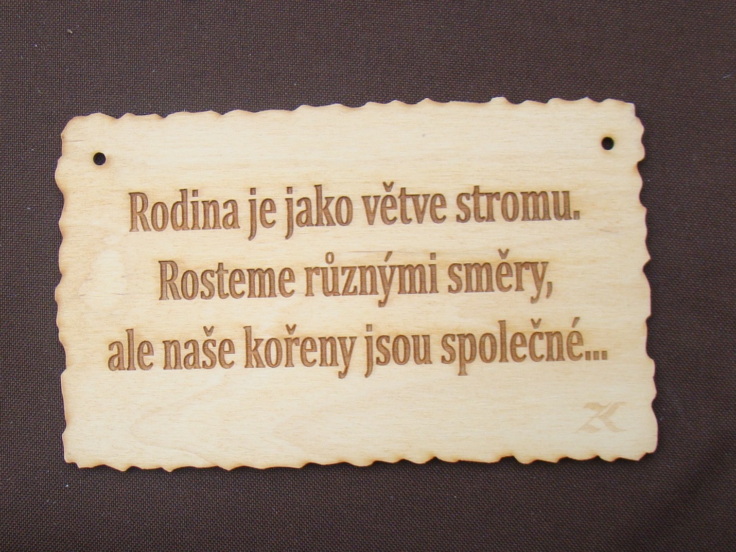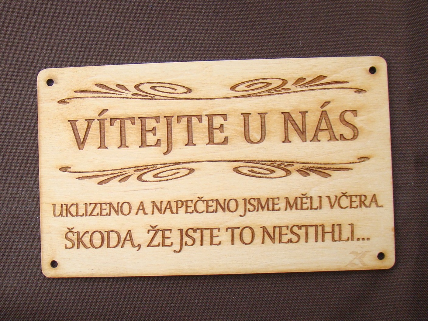 Rozšířili jsme sortiment o dřevěné gravírované cedulky, citáty,  portréty z fotografií, obrázky, přáníčka, domovní čísla a jiné dekorace, dále o přívěsky a naušnice z cedrového dřeva. Je možné se domluvit i na vygravírování Vaší fotografie či textu.
