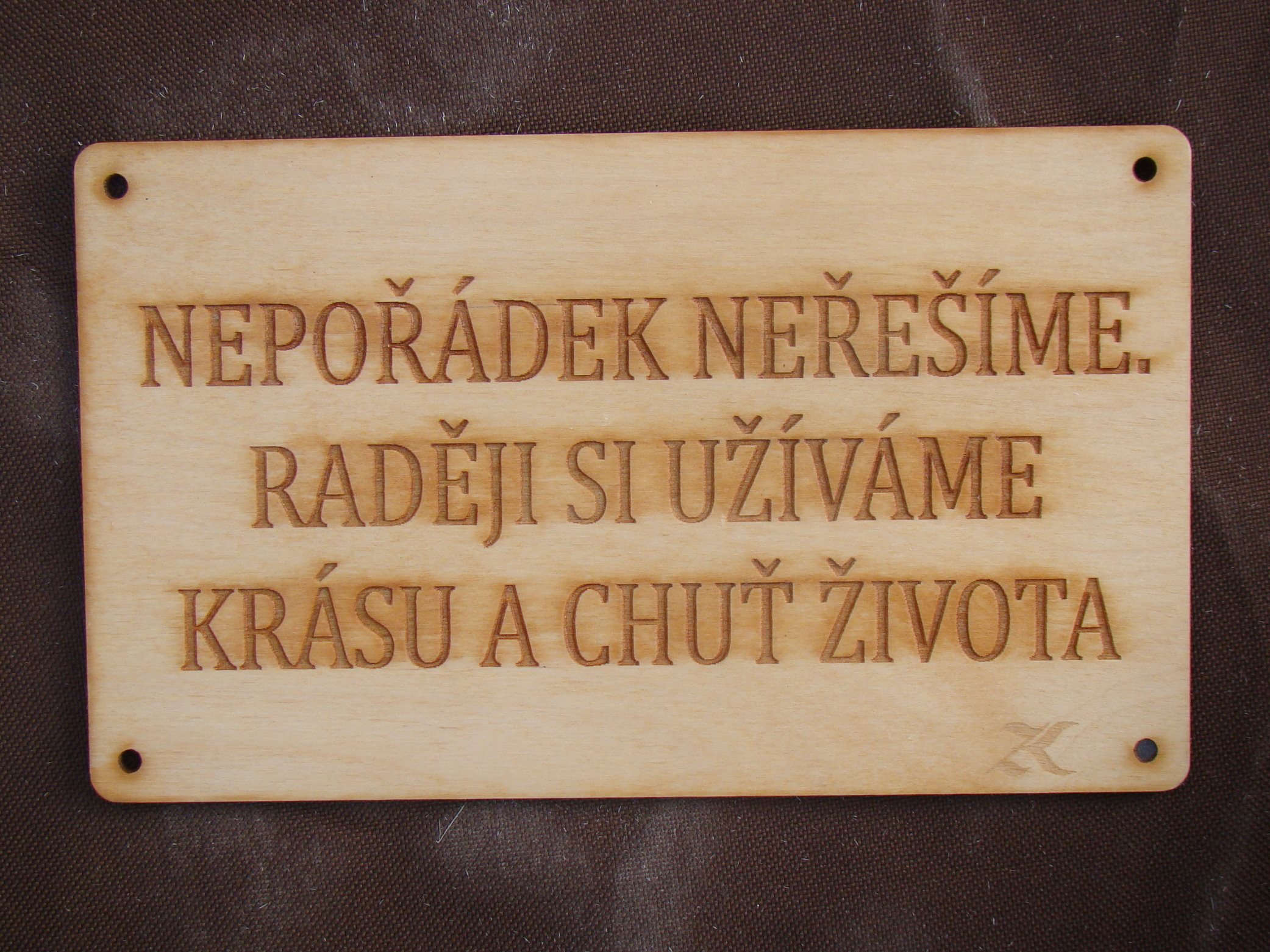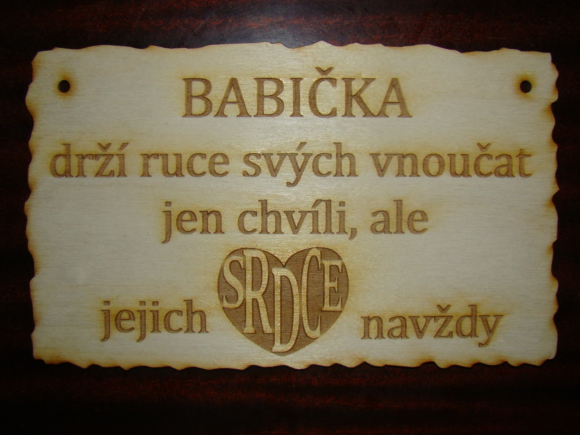 Rozšířili jsme sortiment o dřevěné gravírované cedulky, citáty,  portréty z fotografií, obrázky, přáníčka, domovní čísla a jiné dekorace, dále o přívěsky a naušnice z cedrového dřeva. Je možné se domluvit i na vygravírování Vaší fotografie či textu.