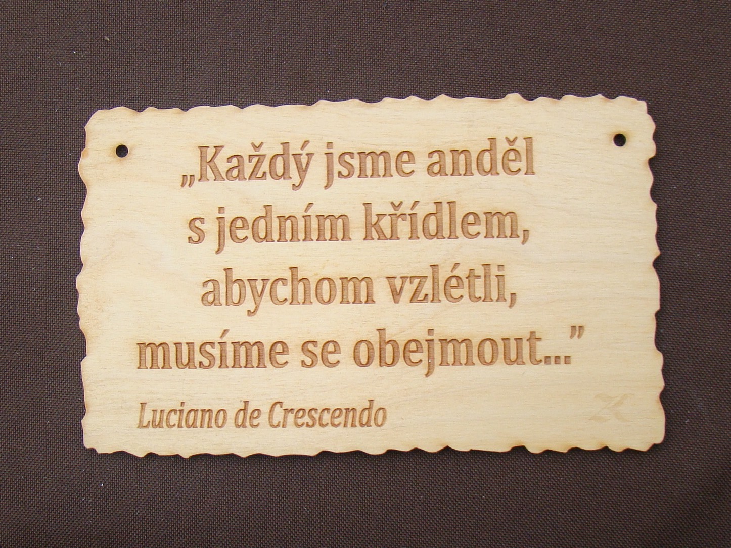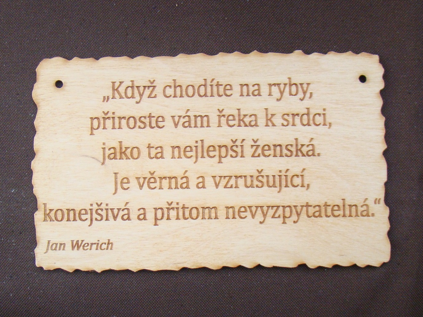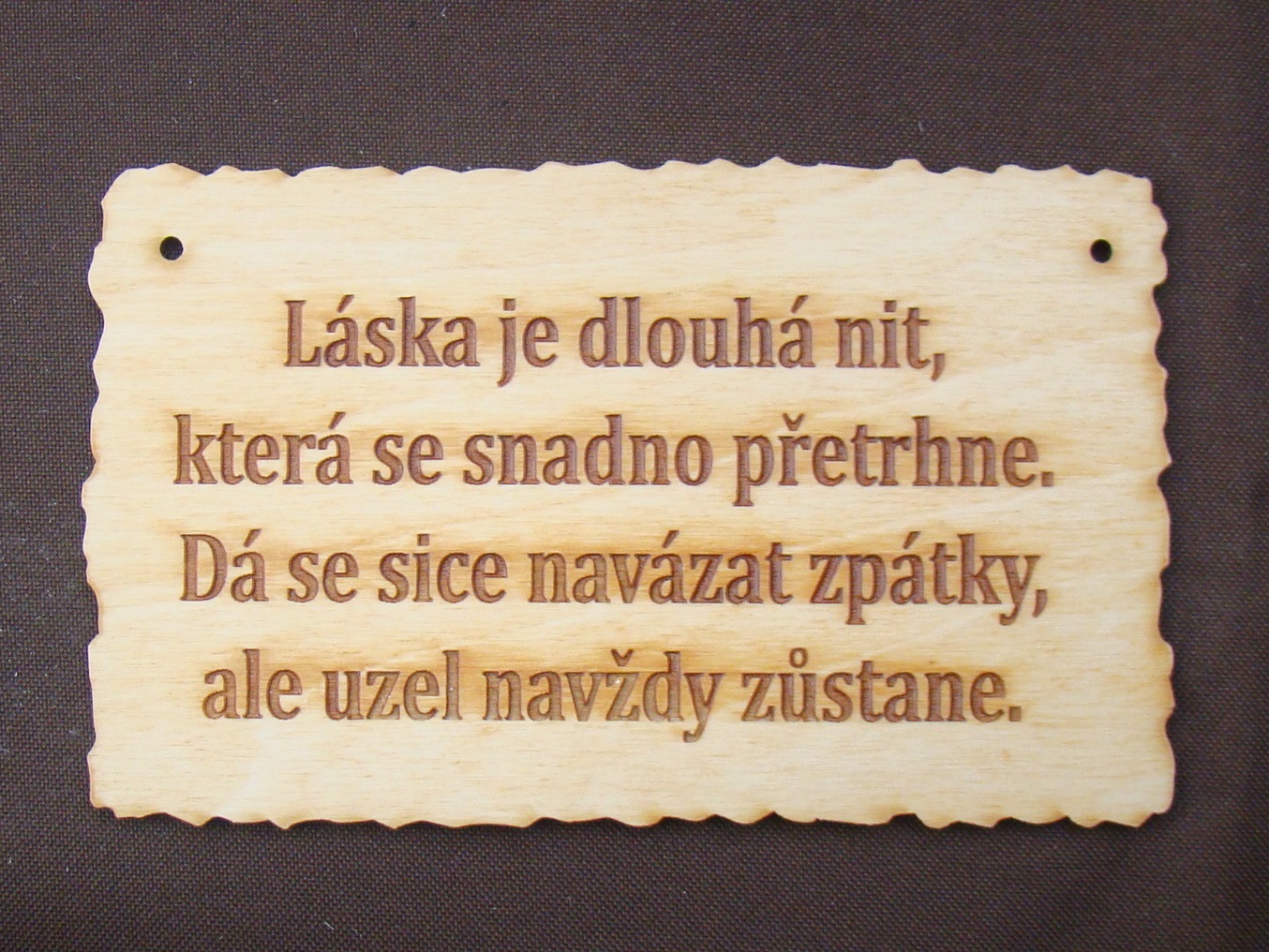 Rozšířili jsme sortiment o dřevěné gravírované cedulky, citáty,  portréty z fotografií, obrázky, přáníčka, domovní čísla a jiné dekorace, dále o přívěsky a naušnice z cedrového dřeva. Je možné se domluvit i na vygravírování Vaší fotografie či textu.