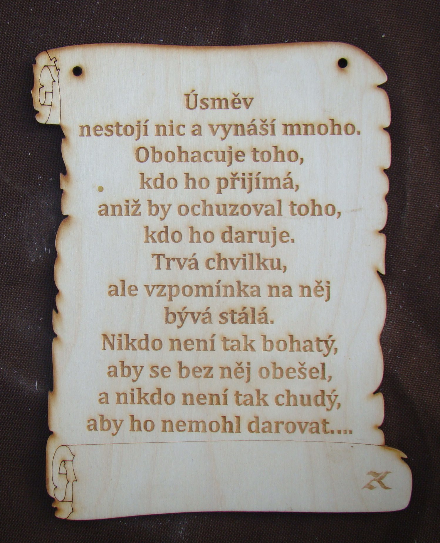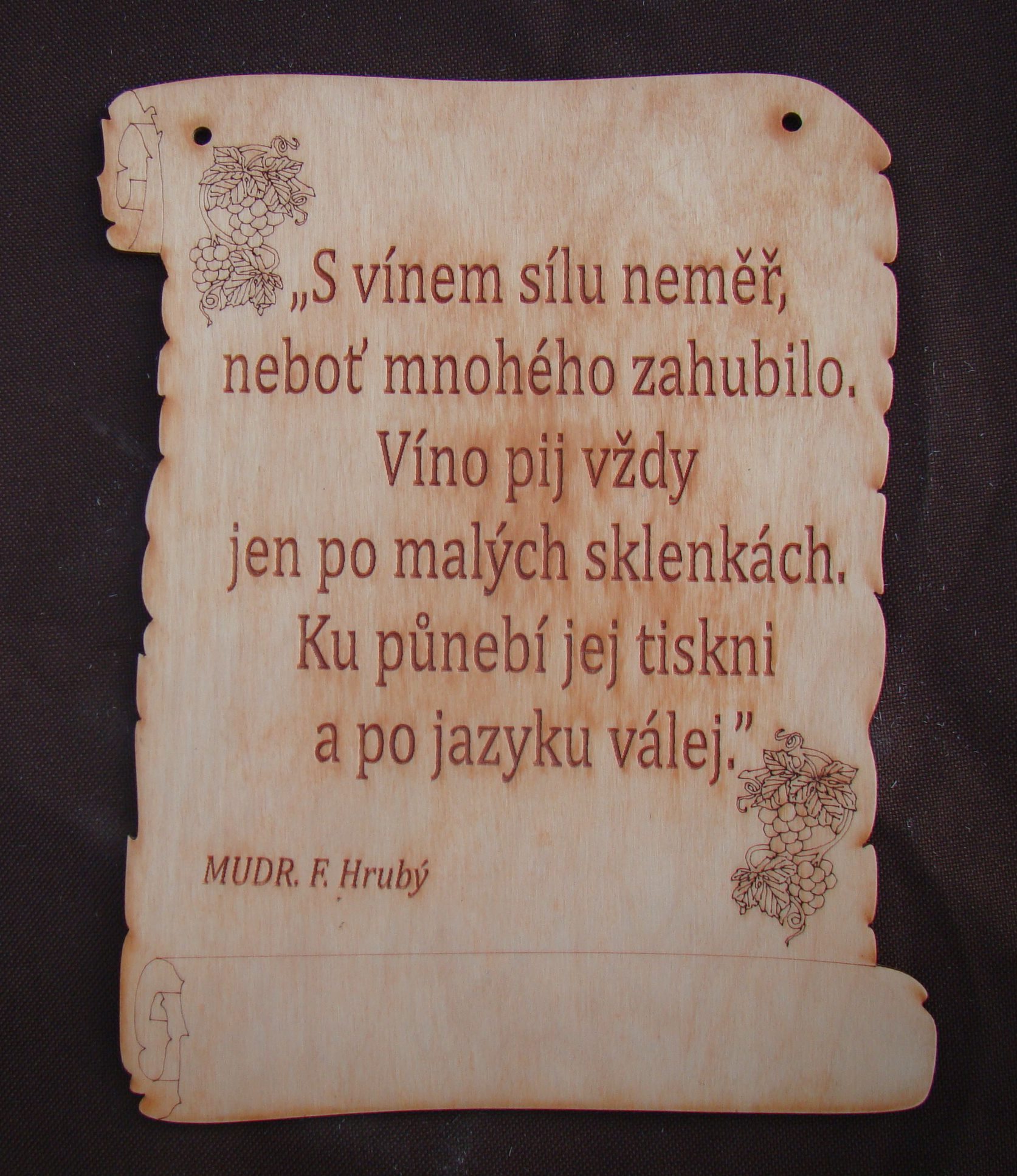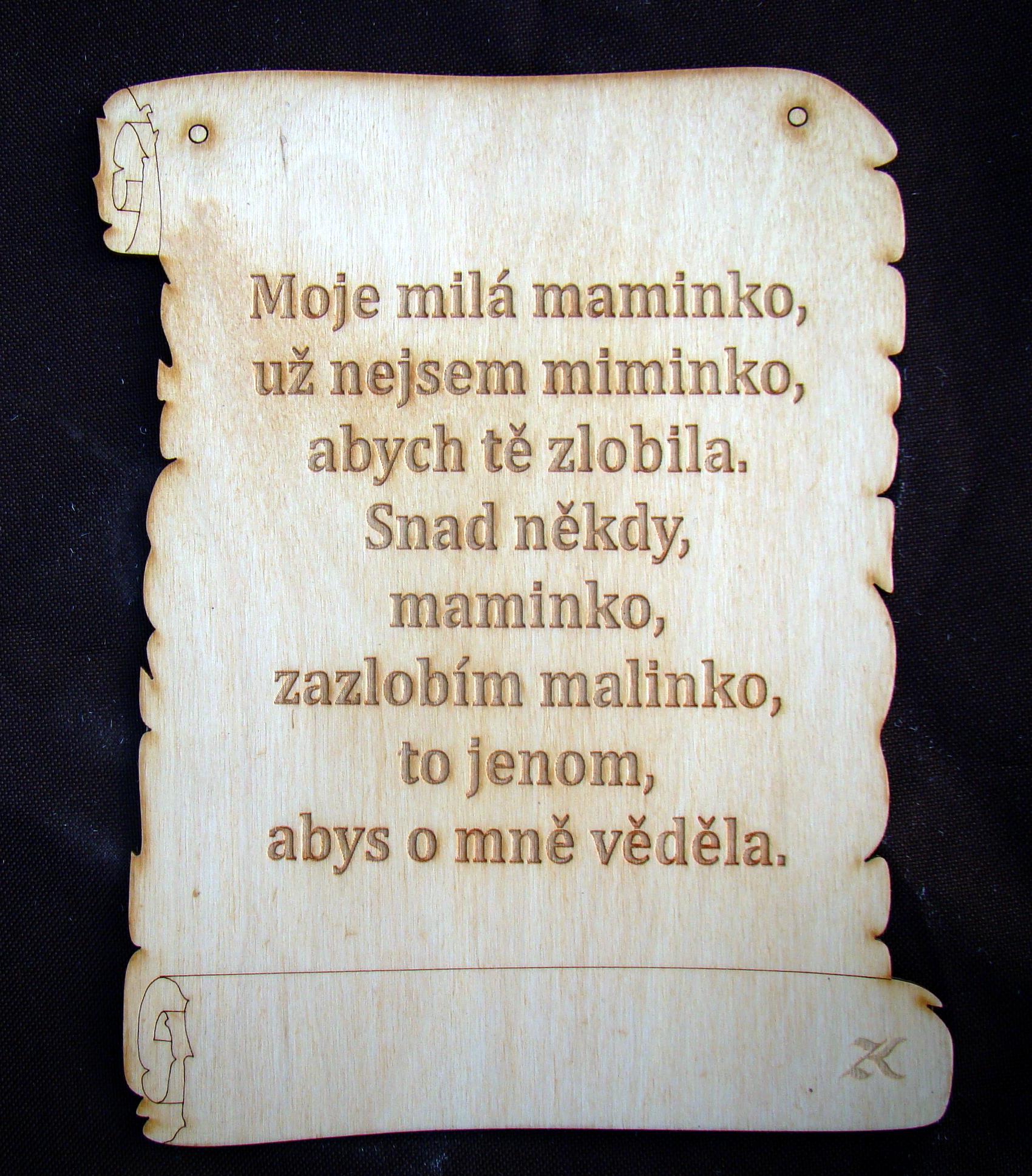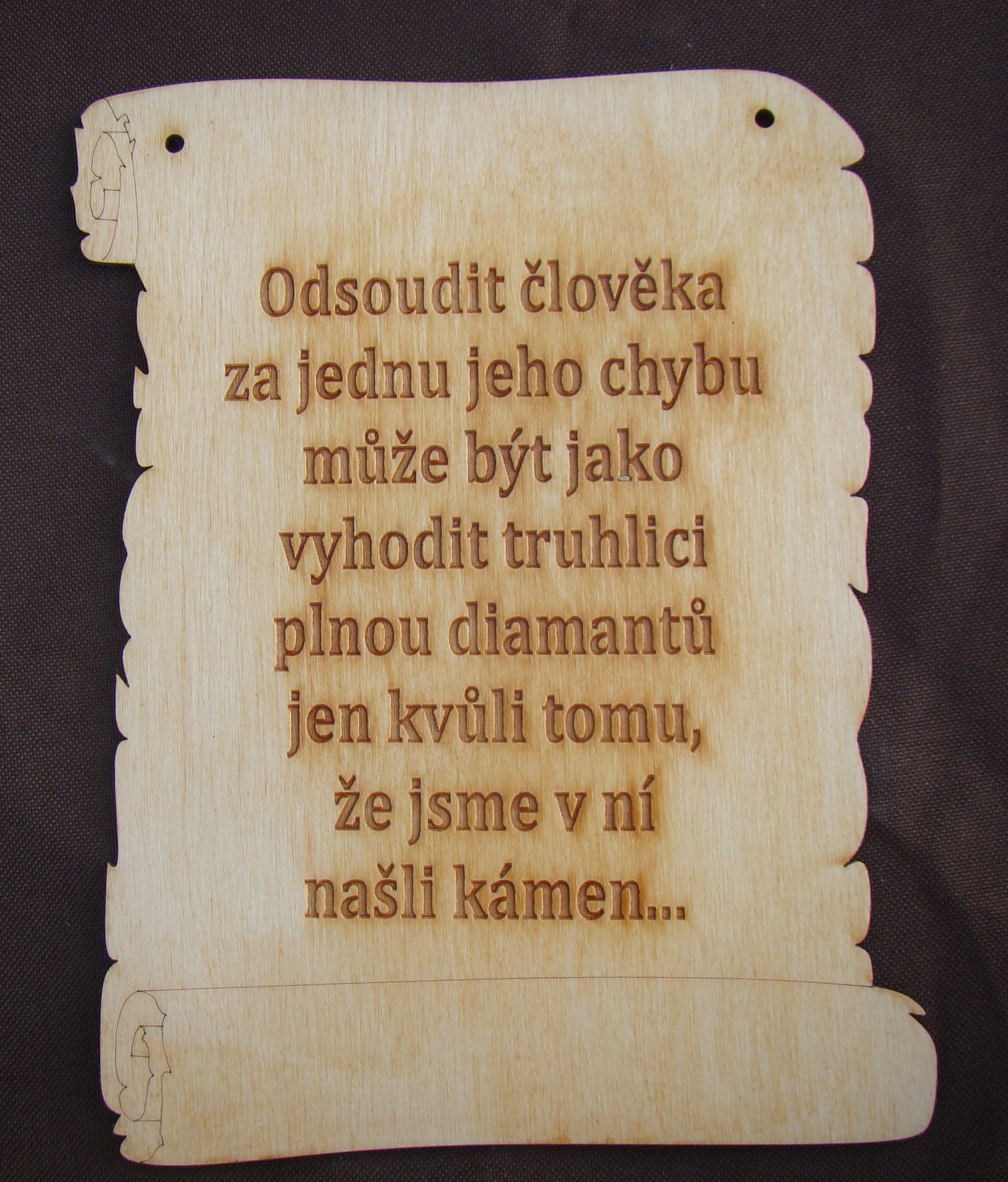 Laserem gravírované cedulky z 3mm březové překližky, 2 vrstvy laku, "svitek" 24 x 18 cm