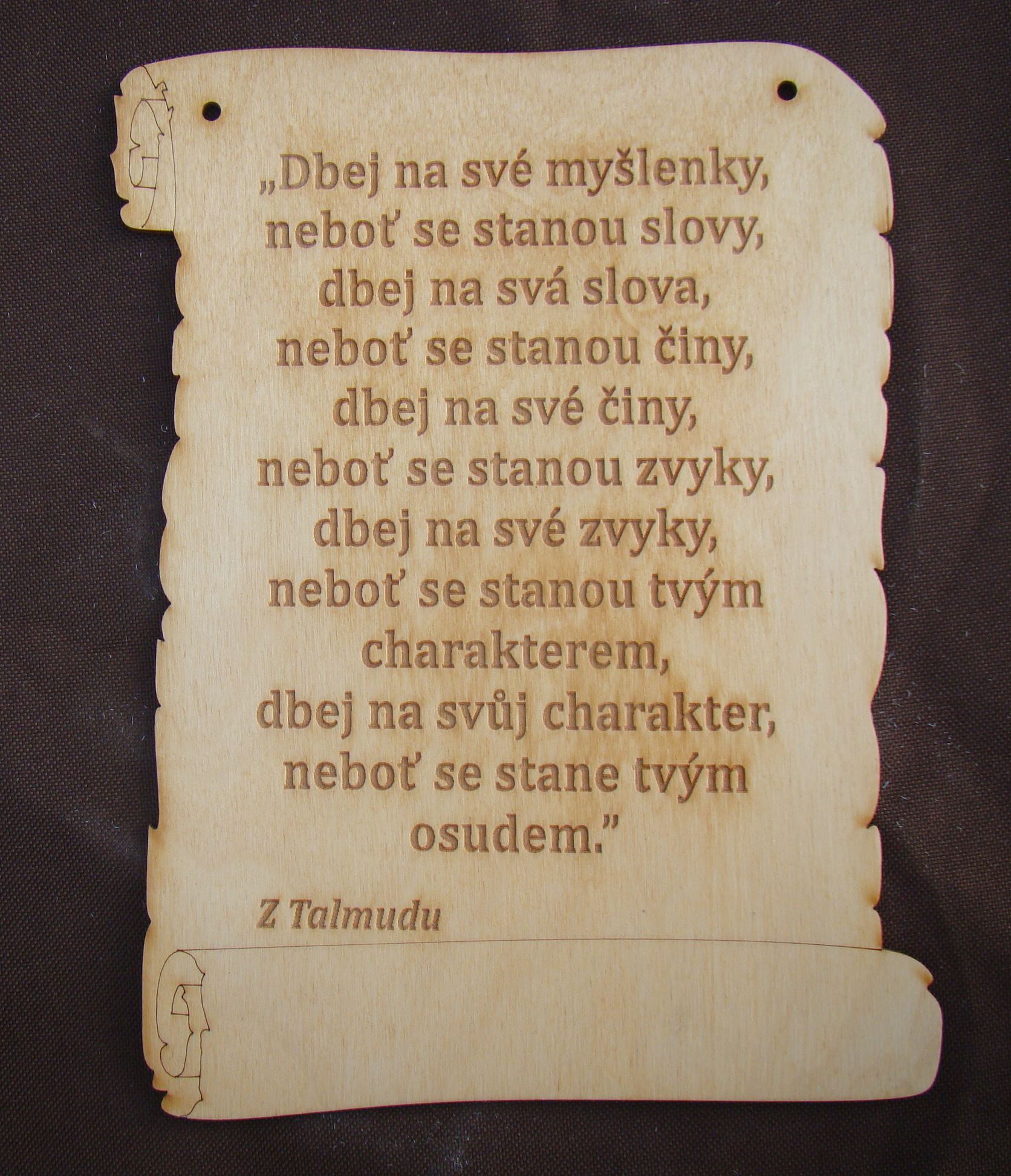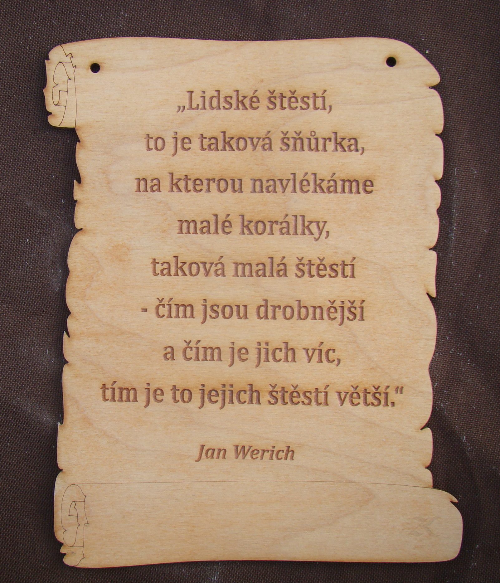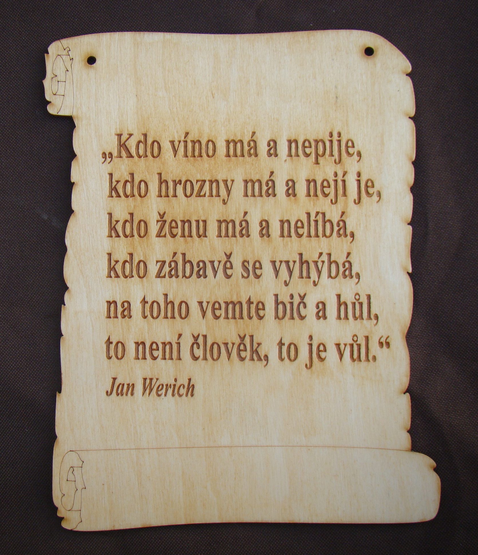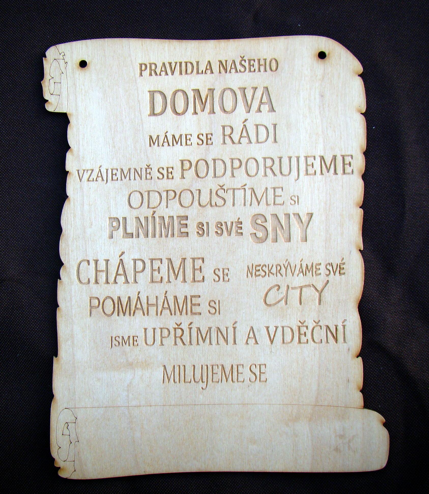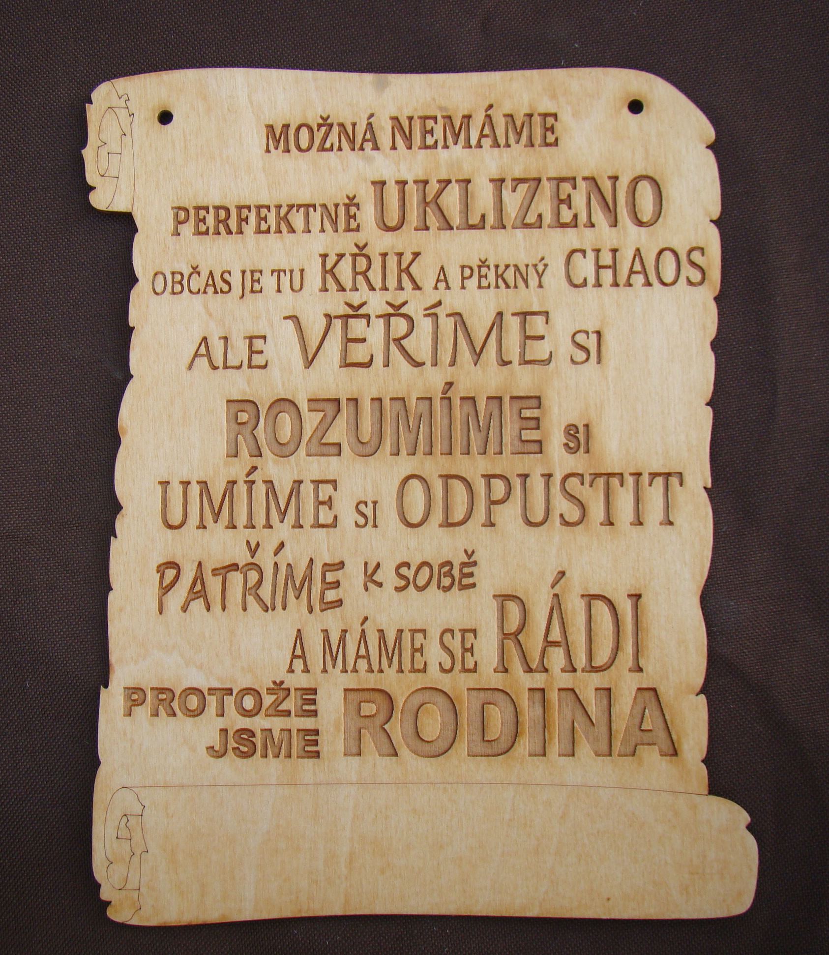 Laserem gravírované cedulky z 3mm březové překližky, 2 vrstvy laku, "svitek" 24 x 18 cm