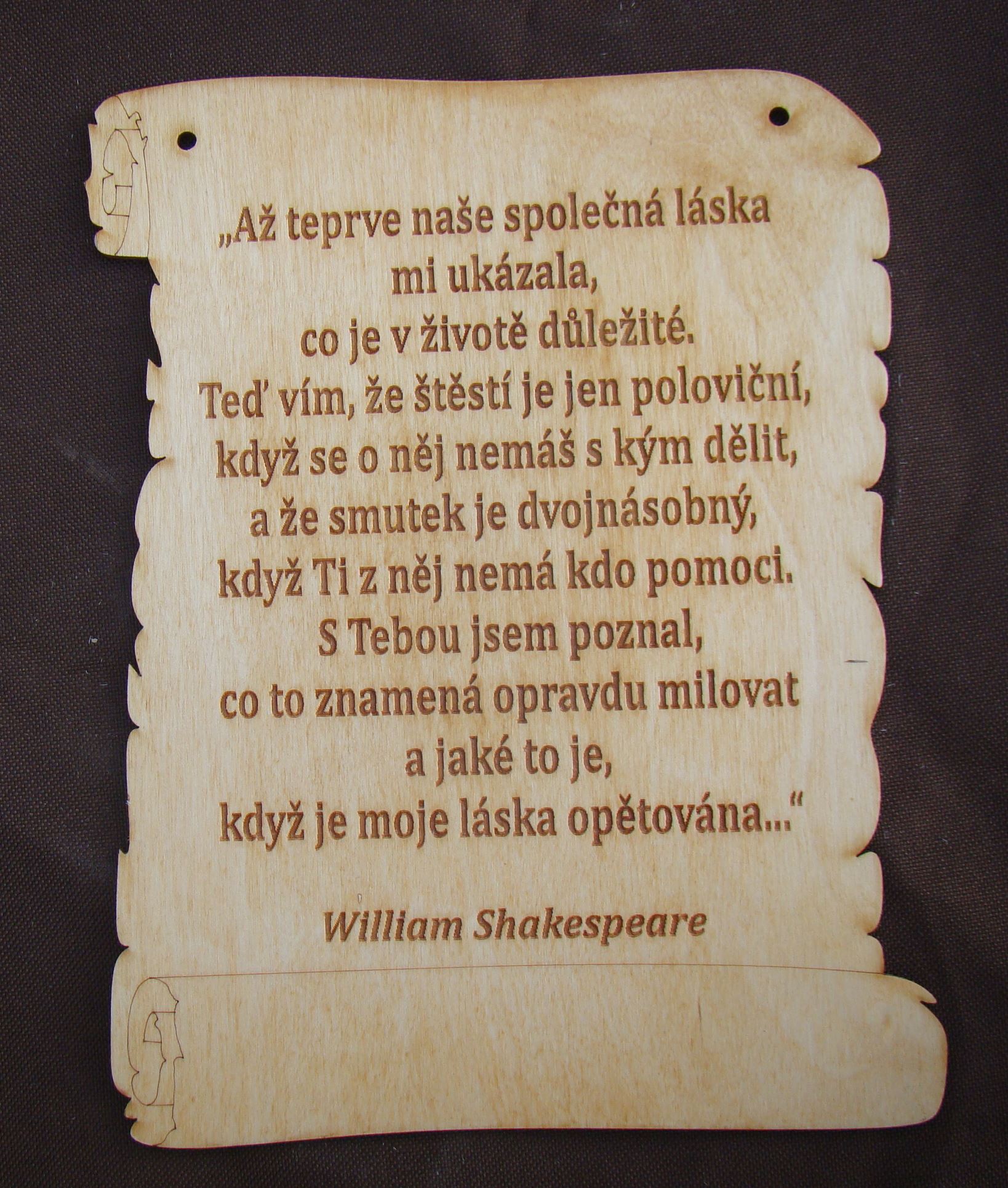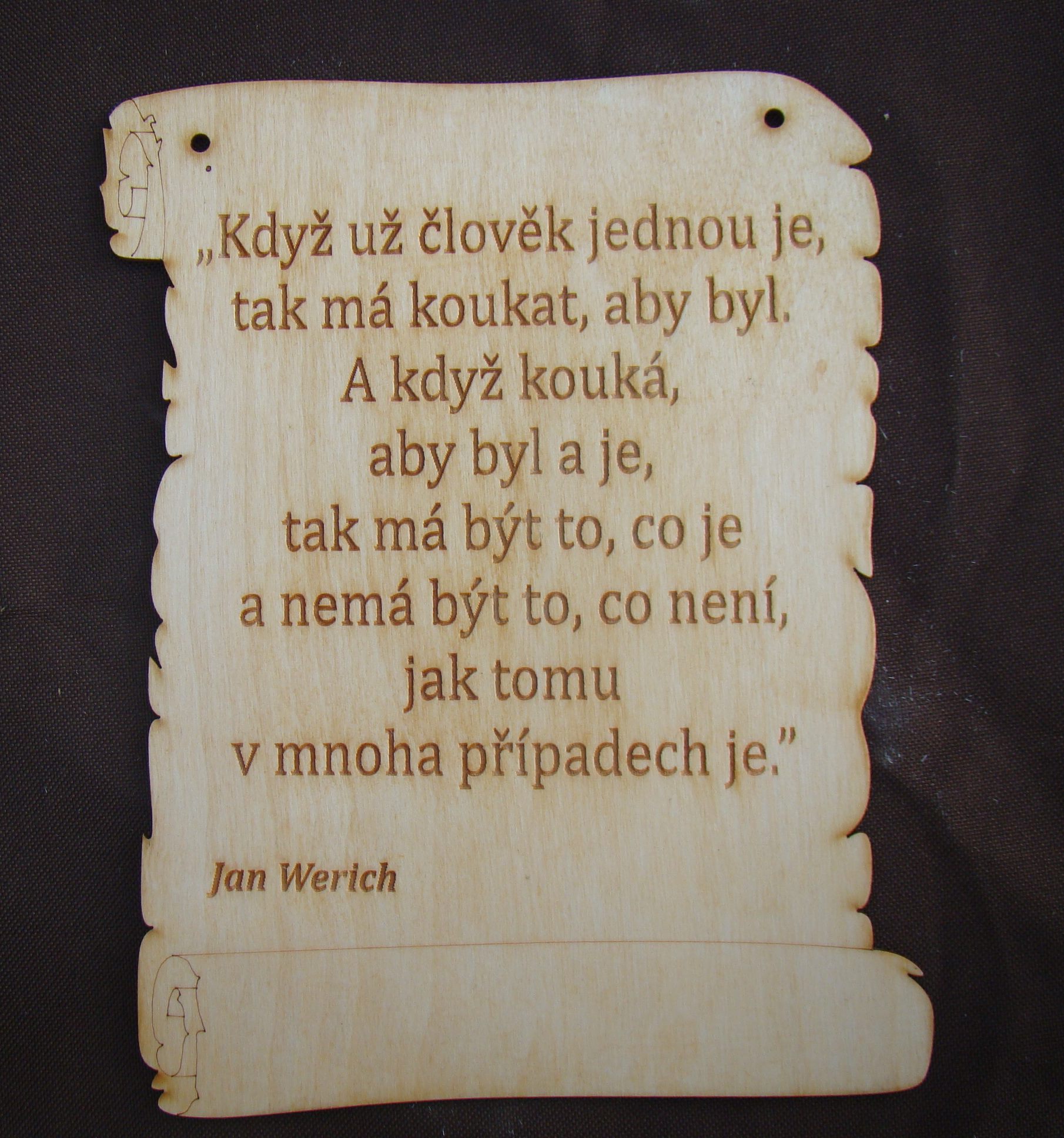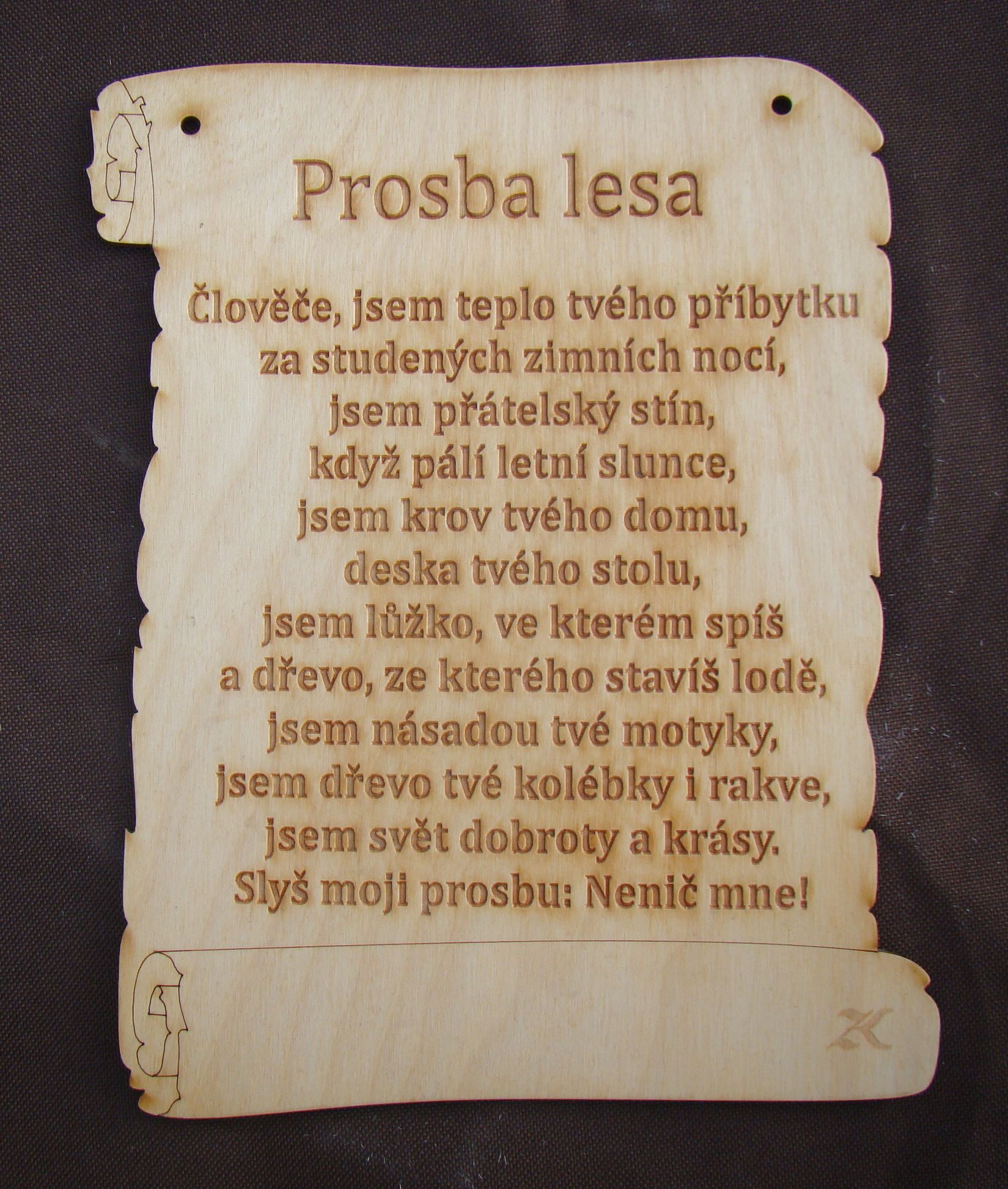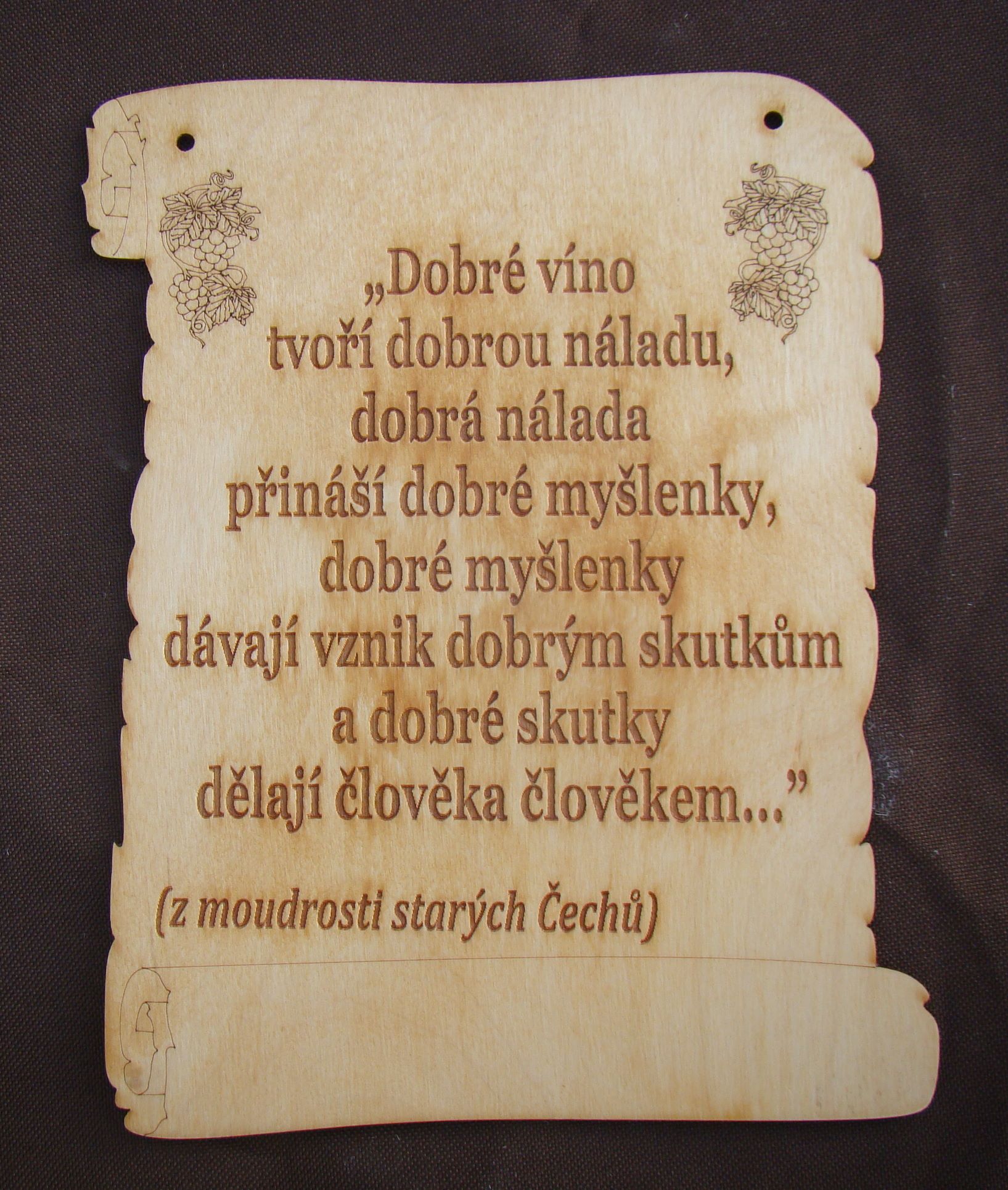 Rozšířili jsme sortiment o dřevěné gravírované cedulky, citáty, portréty z fotografií, obrázky, přáníčka, domovní čísla a jiné dekorace, dále o přívěsky a naušnice z cedrového dřeva. Je možné se domluvit i na vygravírování Vaší fotografie či textu.