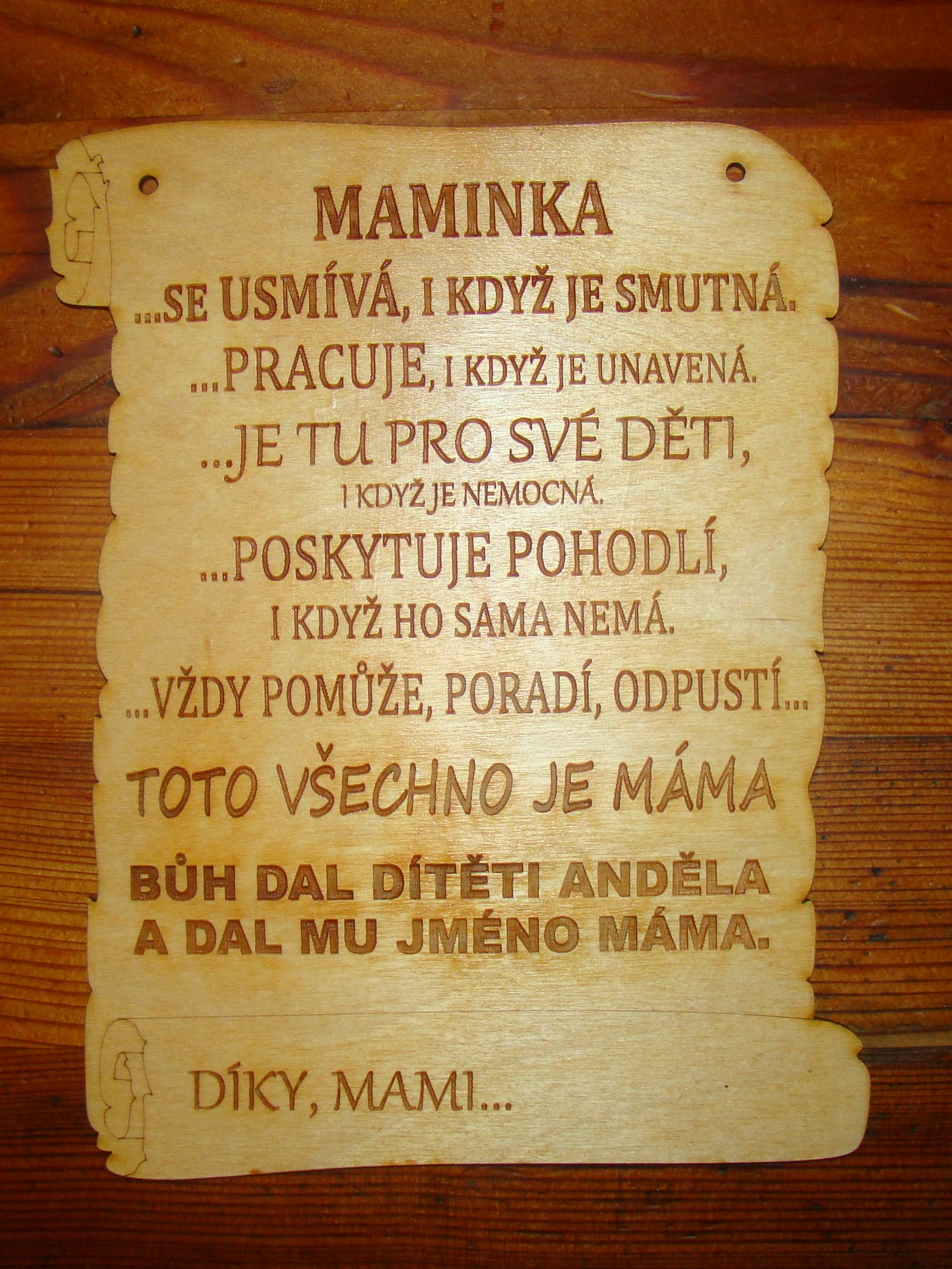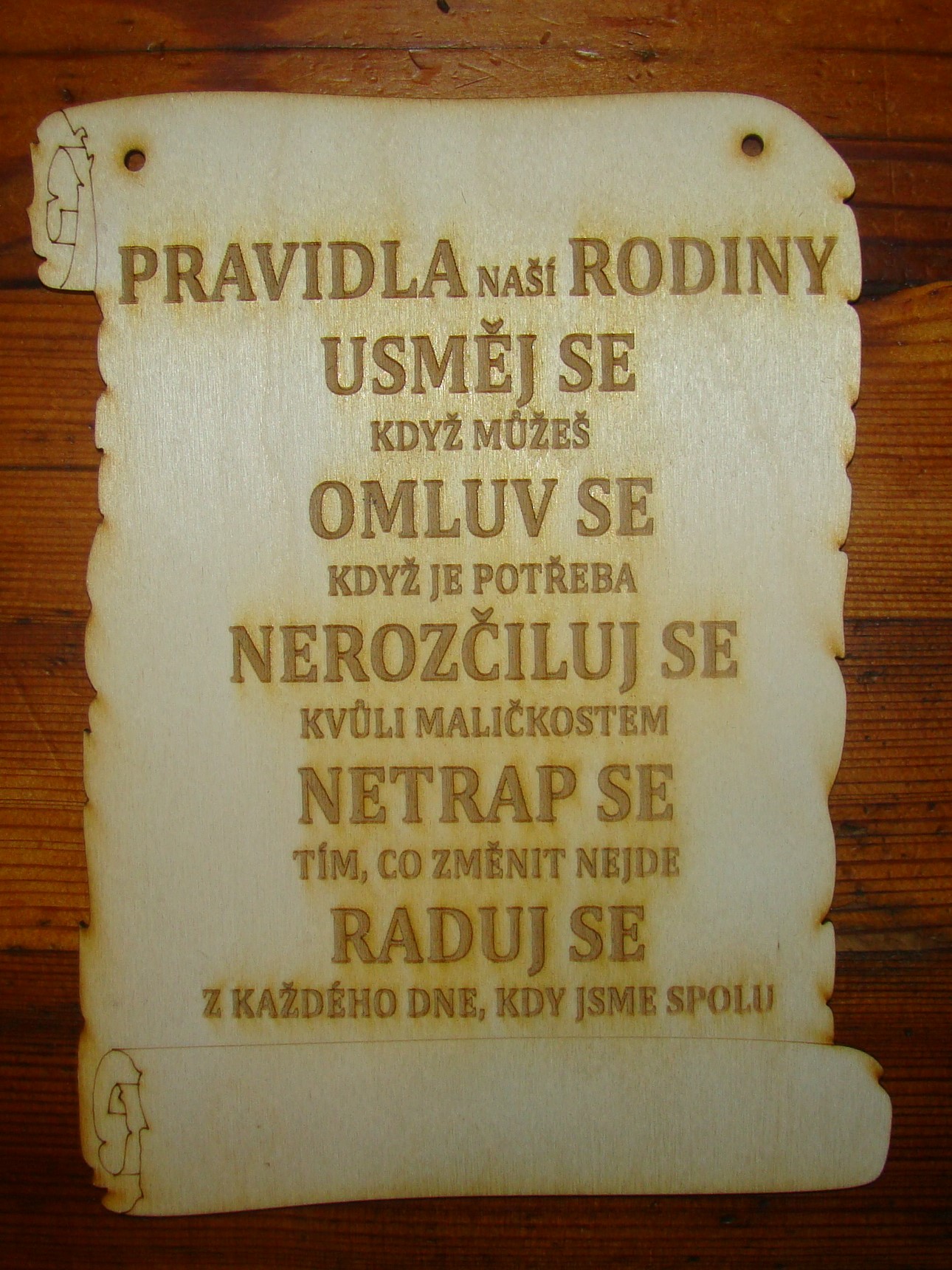 Rozšířili jsme sortiment o dřevěné gravírované cedulky, citáty, portréty z fotografií, obrázky, přáníčka, domovní čísla a jiné dekorace, dále o přívěsky a naušnice z cedrového dřeva. Je možné se domluvit i na vygravírování Vaší fotografie či textu.