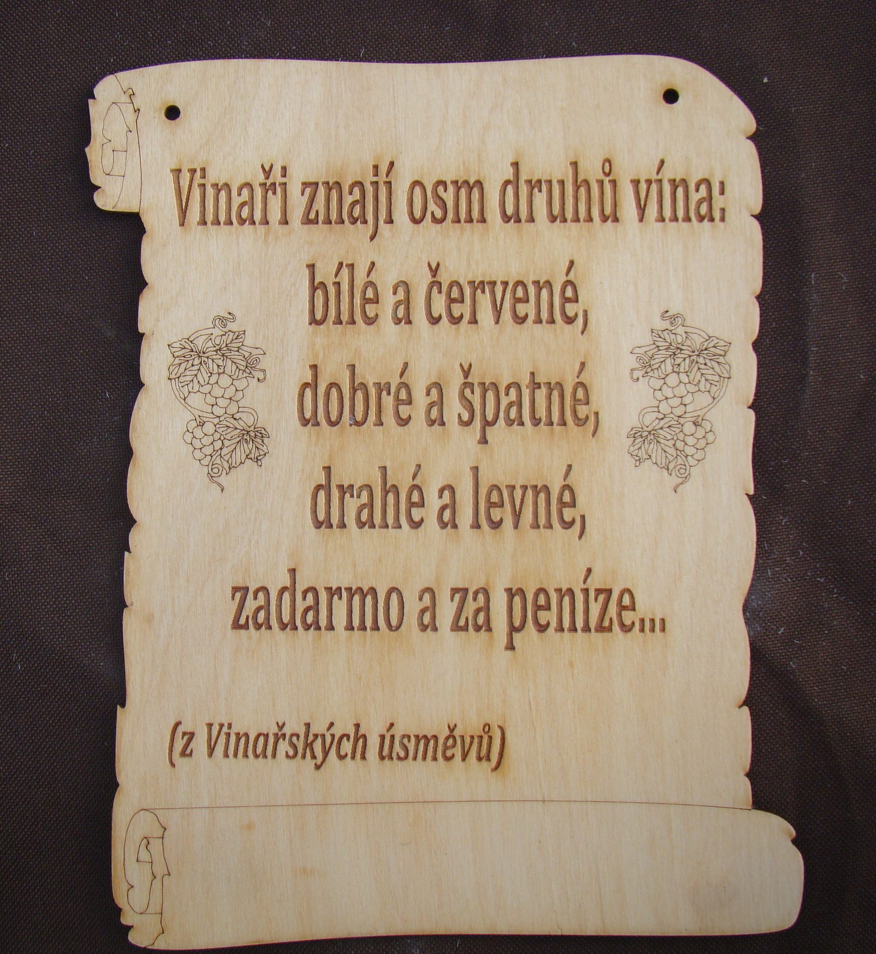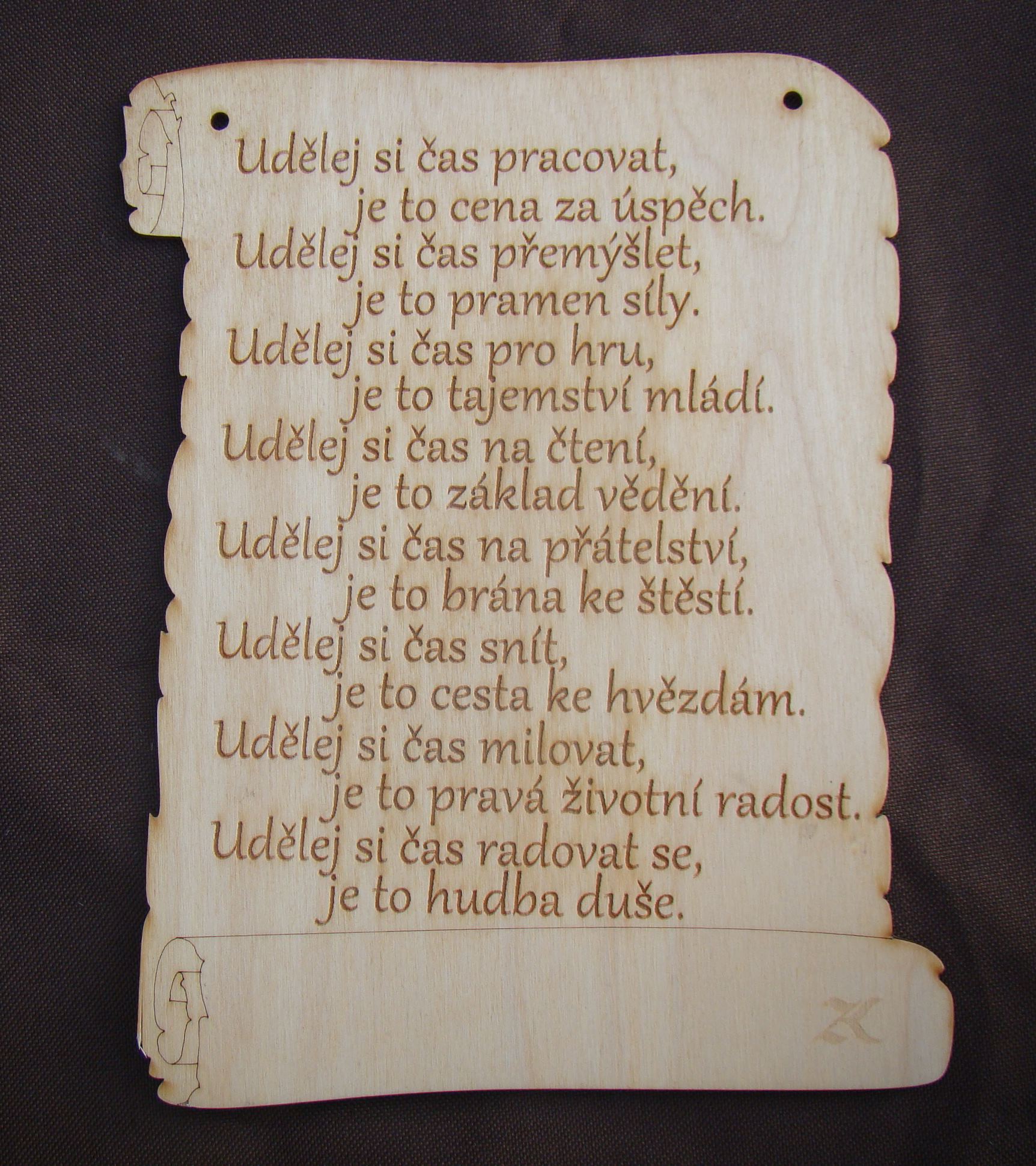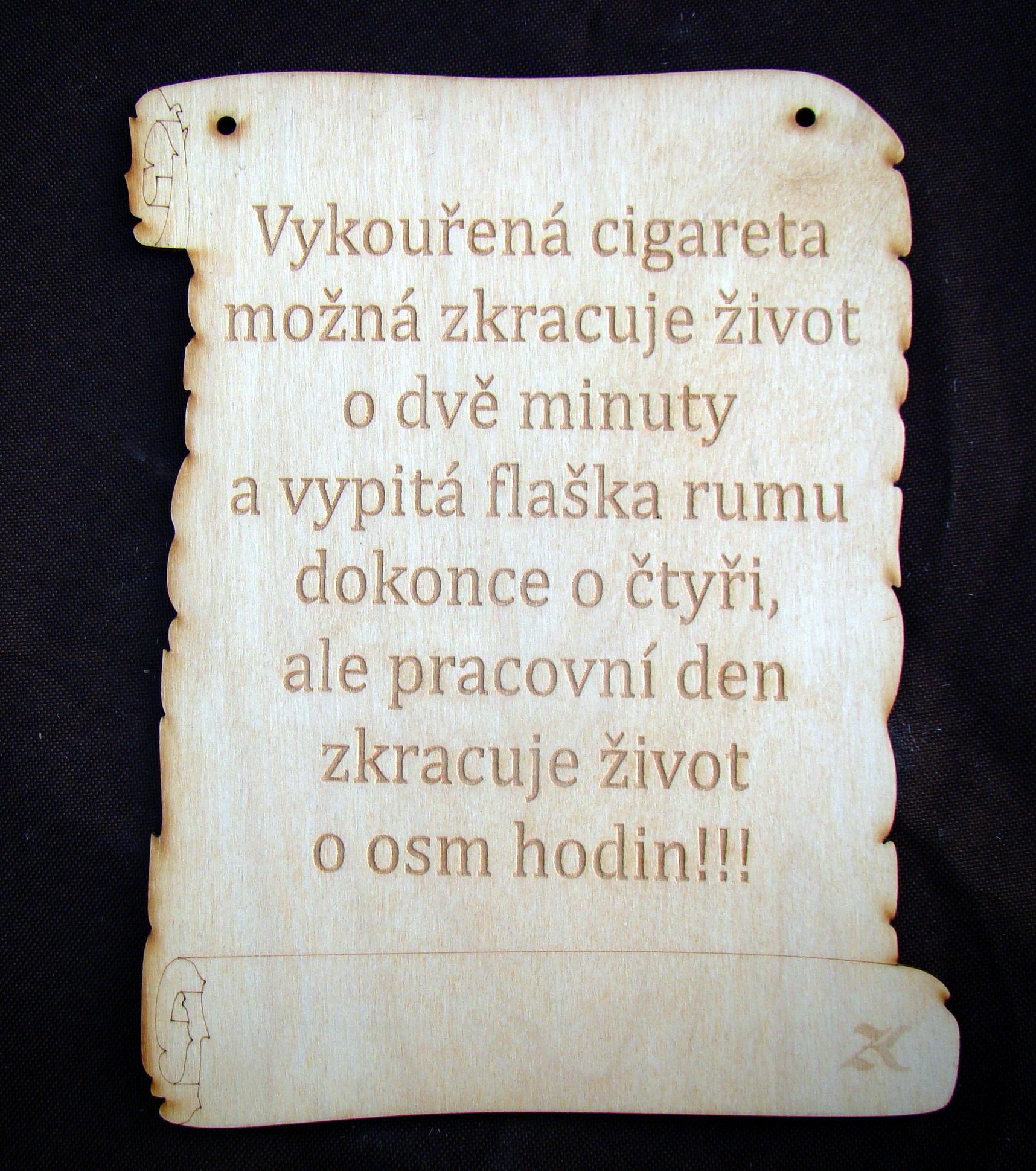 Laserem gravírované cedulky z 3mm březové překližky, 2 vrstvy laku, "svitek" 24 x 18 cm
